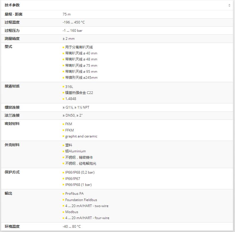 VEGAPULS 68雷達傳感器用于惡劣過程條件下的大范圍粒料持續性物位測量。 VEGAPULS 68 是測量高料罐,大貯倉,碎石機和熔爐的理想選擇。 VEGAPULS 68 采用不同天線配置和材料,為幾乎所有應用提供佳解決方案。 溫度和壓力范圍大,測量儀表應用廣泛,方便項目計劃。